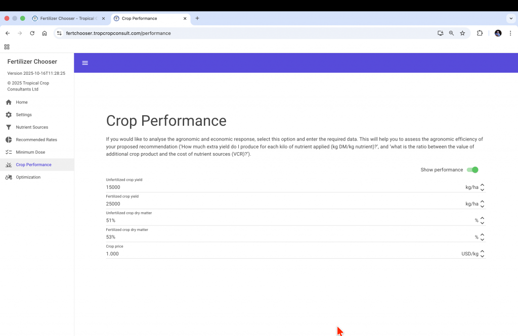 The Crop Performance screen allows you to enter details of crop performance so that the app can calculate important ratios that assess the agronomic and economic efficiency of the nutrient sources selected to implement the nutrient recommendation.