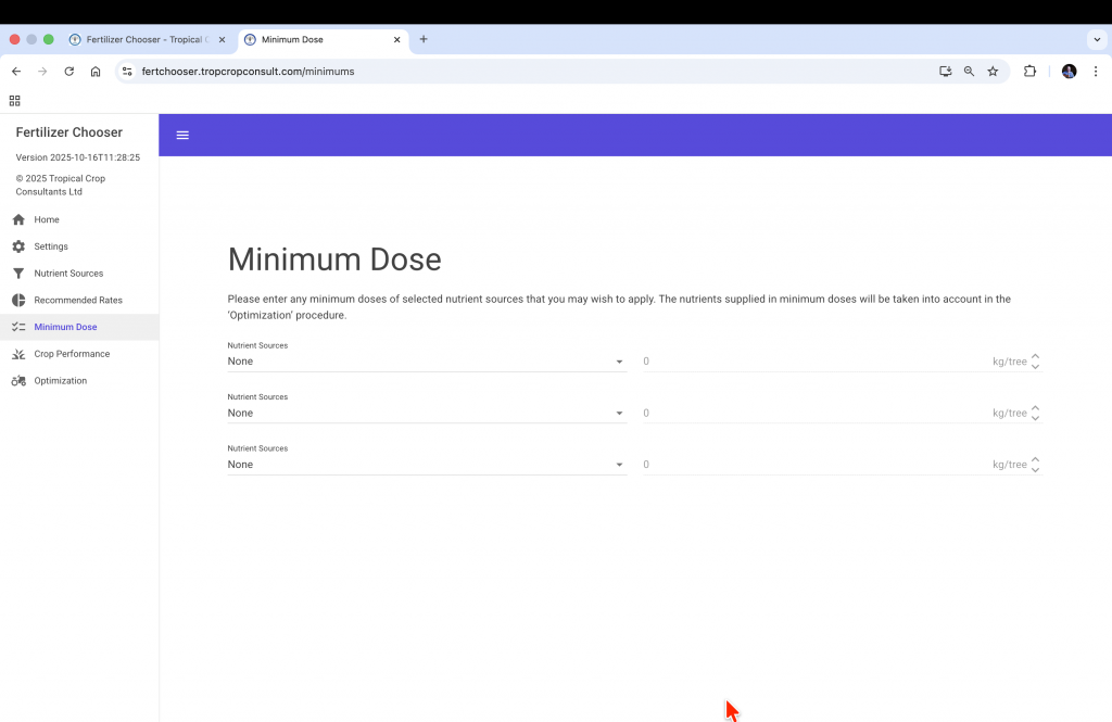 The Minimum Dose screen allows you to enter up to three minimum application rates. For example, you may want to apply a certain amount of organic manure and then optimize the selection of other nutrient sources to complete the nutrient recommendation.