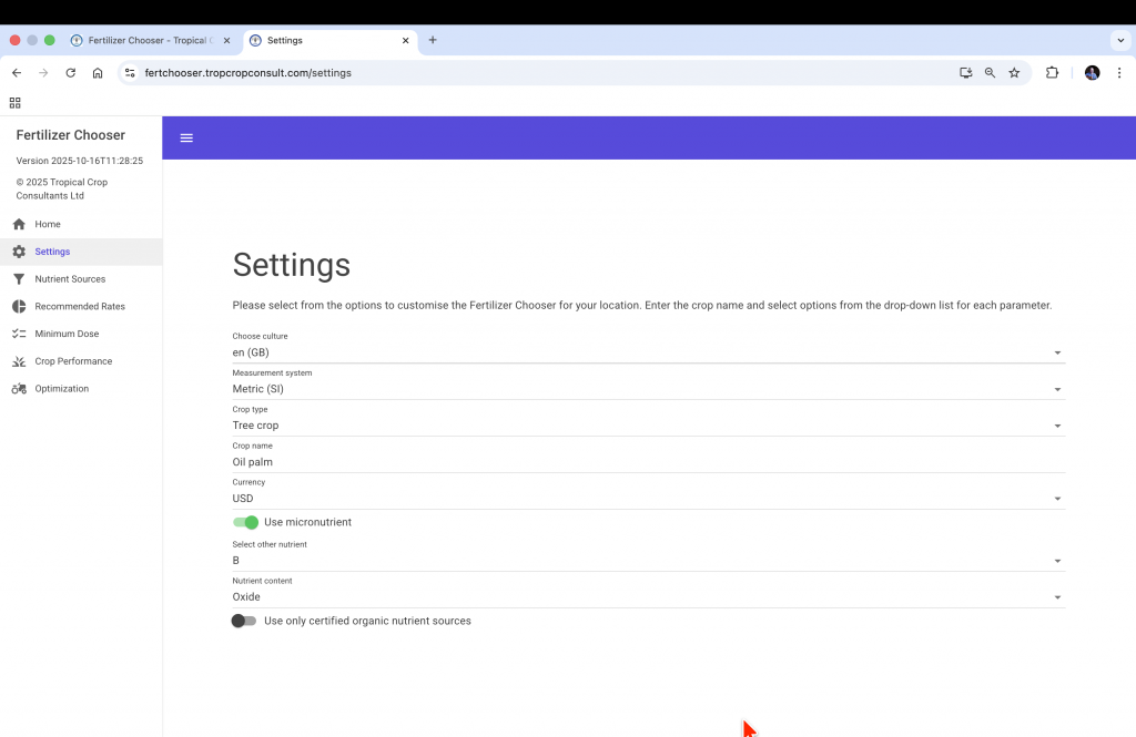 - Choose the local Measurement system (Metric (SI) or Imperial (USA) and crop type (annual crop, tree crop).