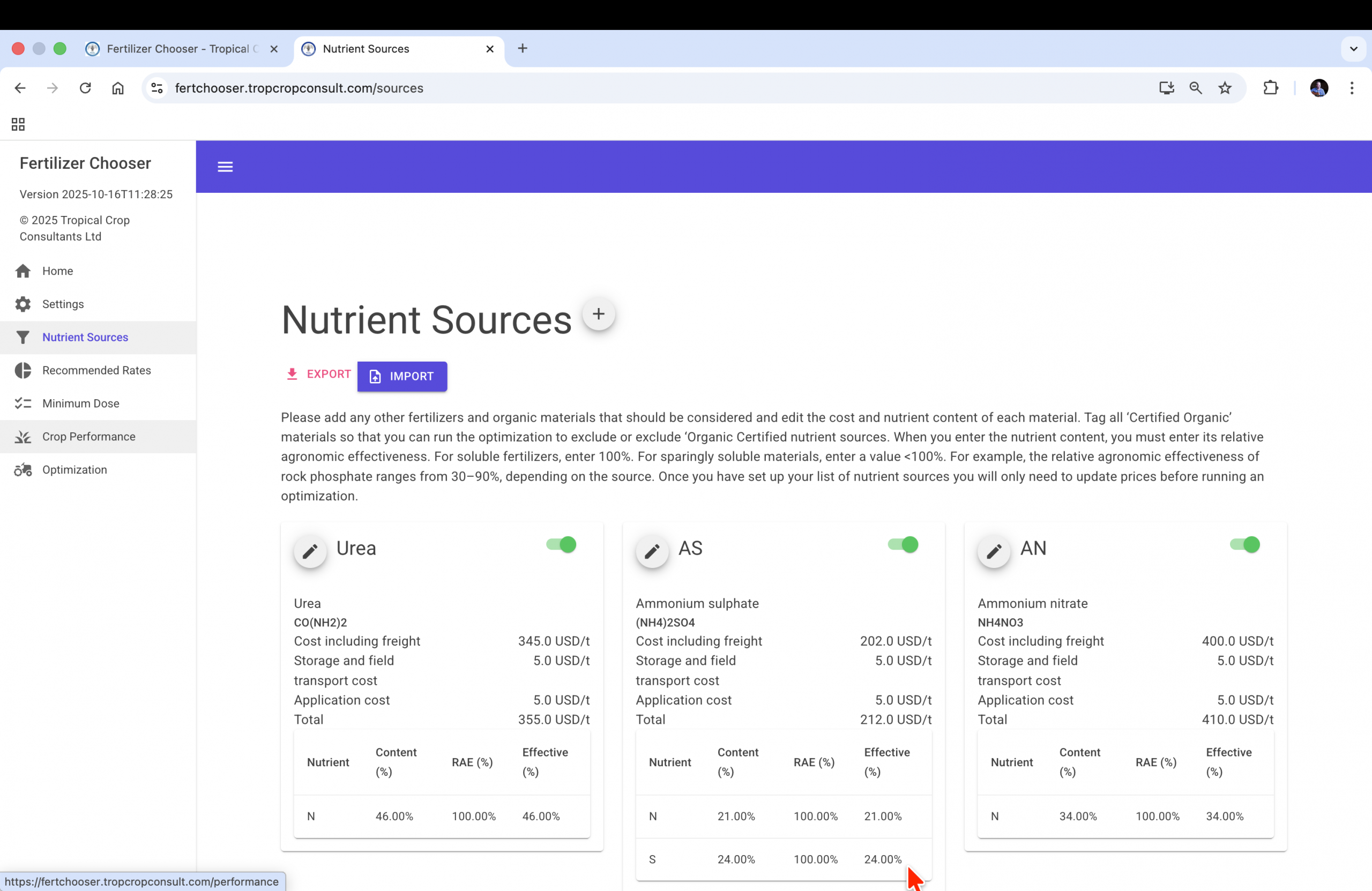 - You can then select all the nutrient sources that you wish to be included in the optimisation based on local availability.
